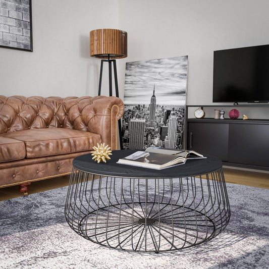 Runswick Round Coffee Table with MDF Tabletop Storage Space in Black Steel Base