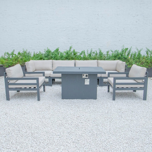 Chelsea 7-Piece Patio Sectional And Fire Pit Table In Weathered Grey Aluminum With Cushions
