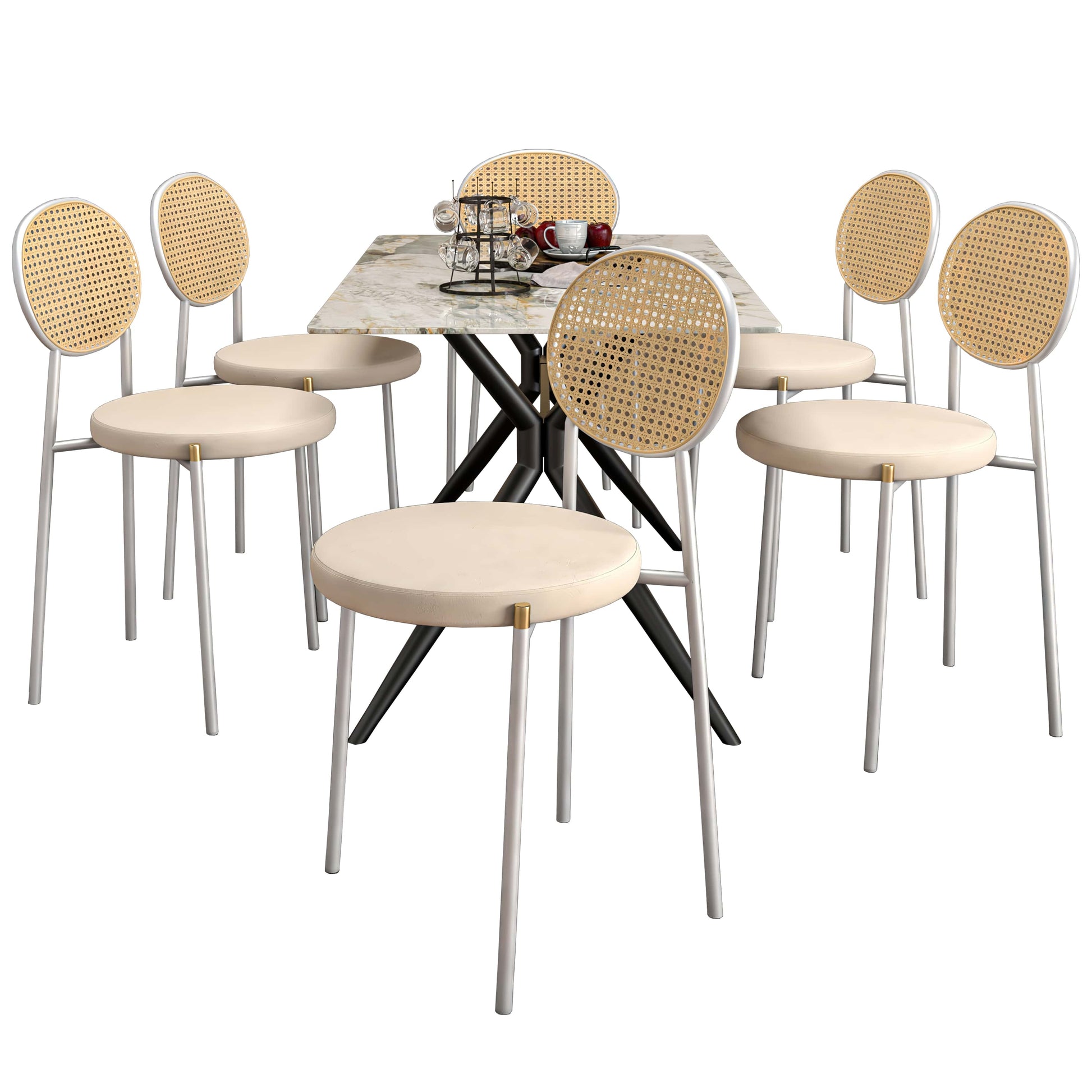 Elega 7-Piece Dining Set with Rectangular Sintered Stone Table and 6 Velvet Side Chairs with Wicker Back