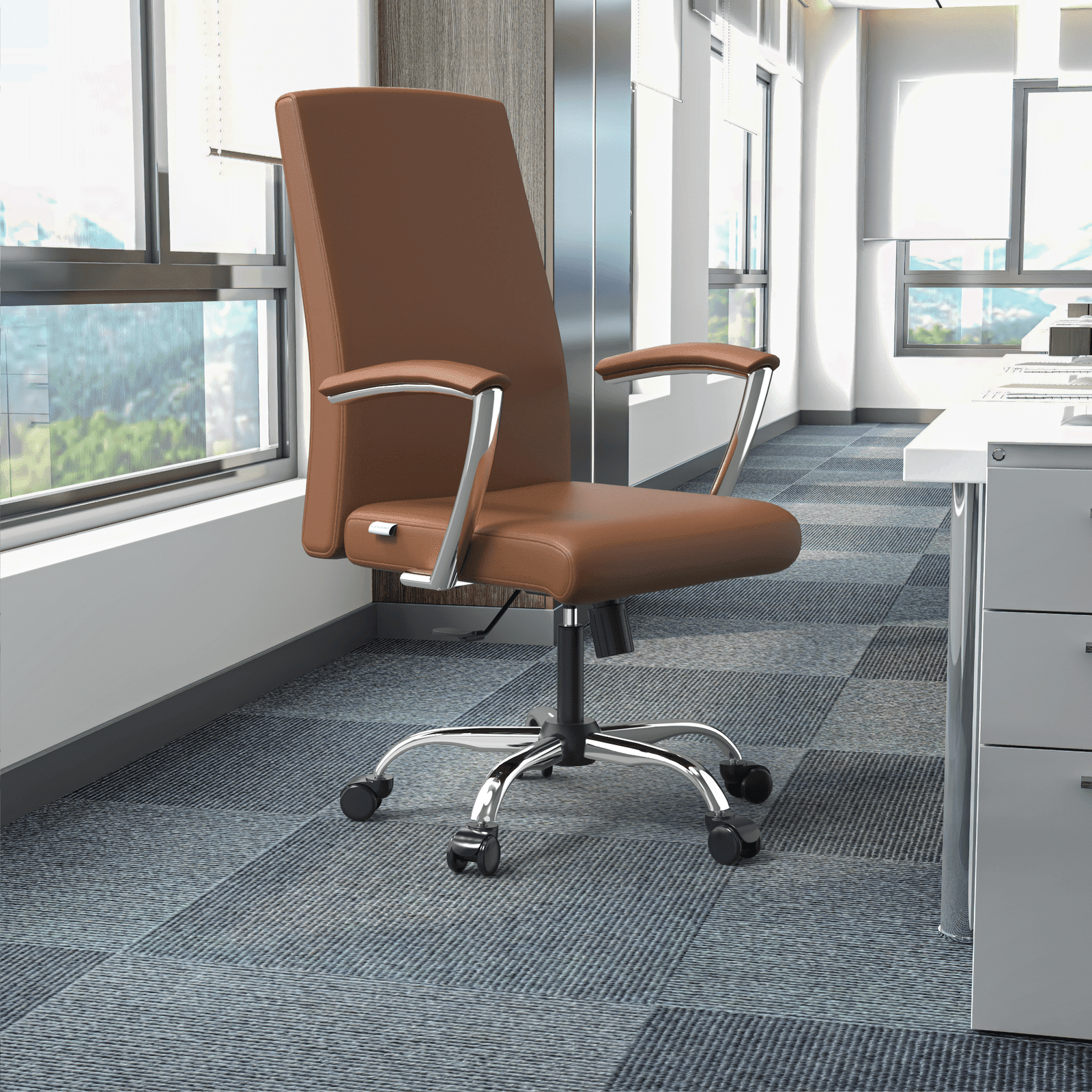 Upgrade your office with the Evander Mid-Century Modern Swivel Office Chair. Made with faux leather and a silver frame, this chair adds a touch of sophistication to any workspace. With the ability to adjust the height for maximum comfort, it is perfect for long days at the office.