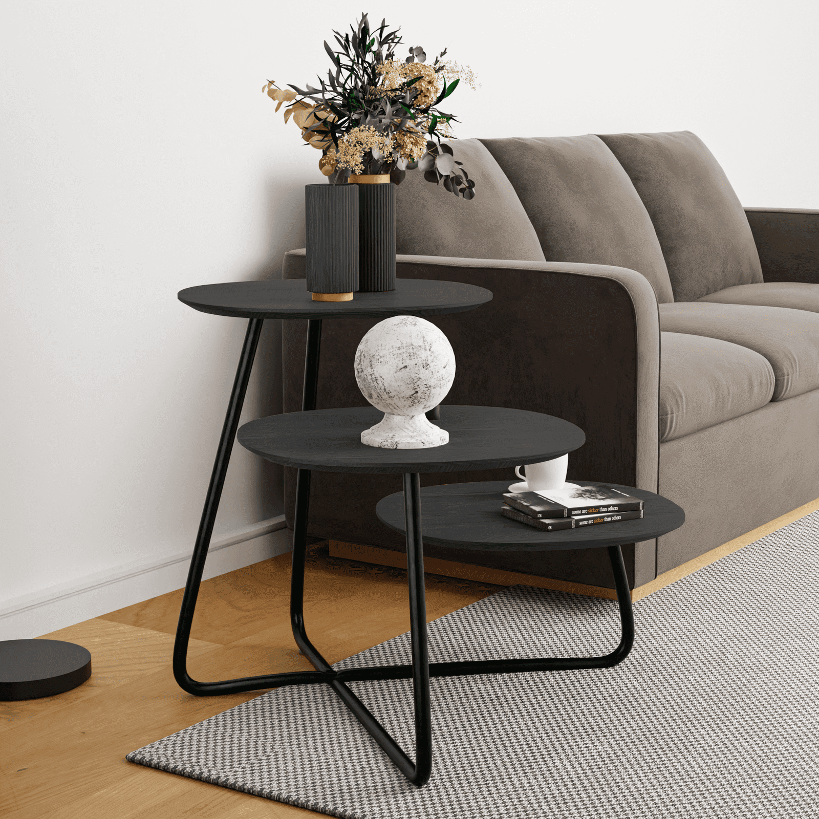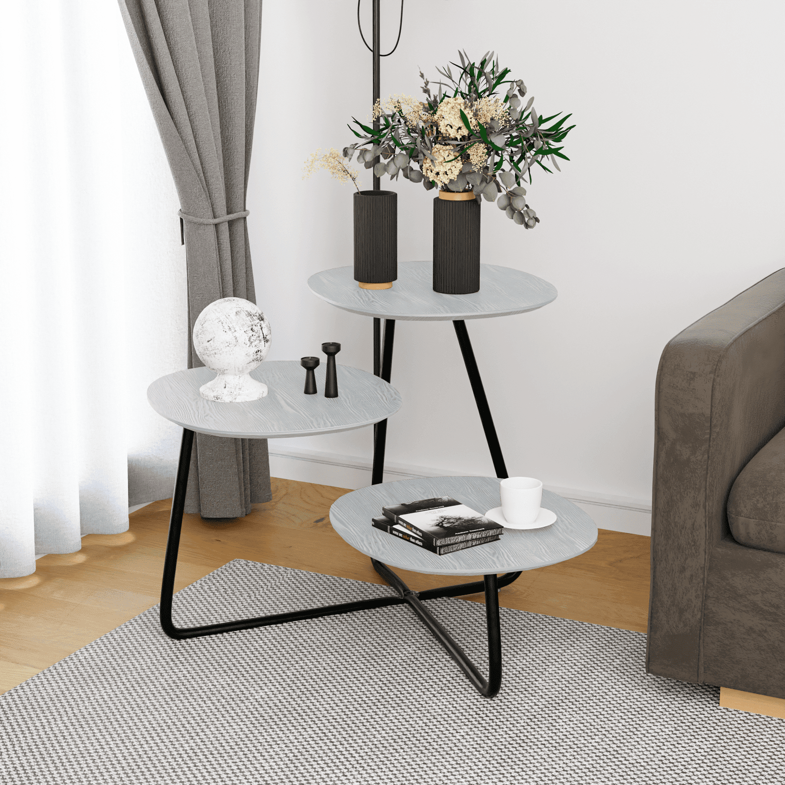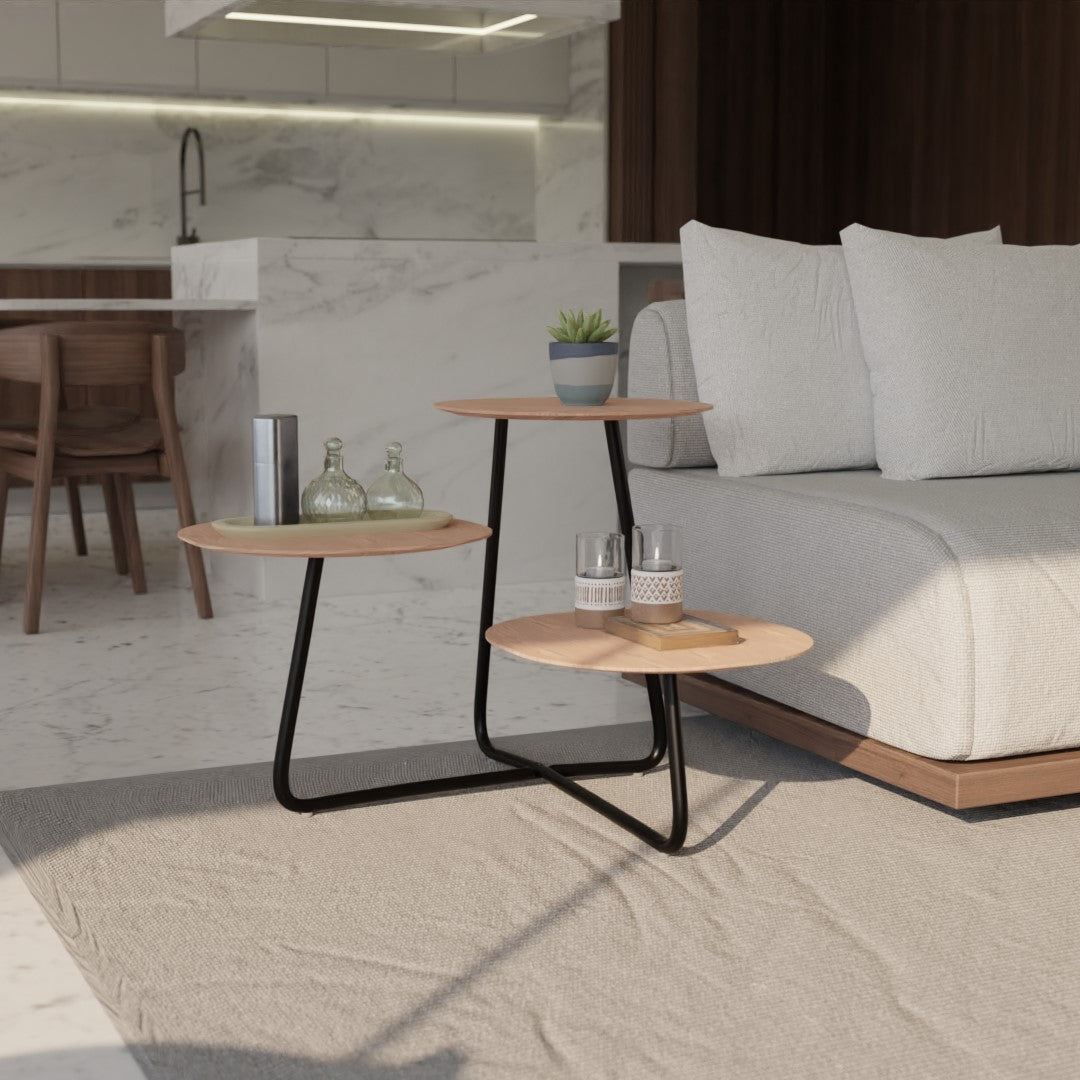 Upgrade your living space with the stylish and durable Hazelton Multi-Top End Tables. Crafted with a manufactured wood top and powder-coated steel frame, this end table offers a chic and lightweight design. The natural wood grain color and three shelves provide ample space for your belongings. With rubber foot protectors, it is both functional and aesthetically pleasing.