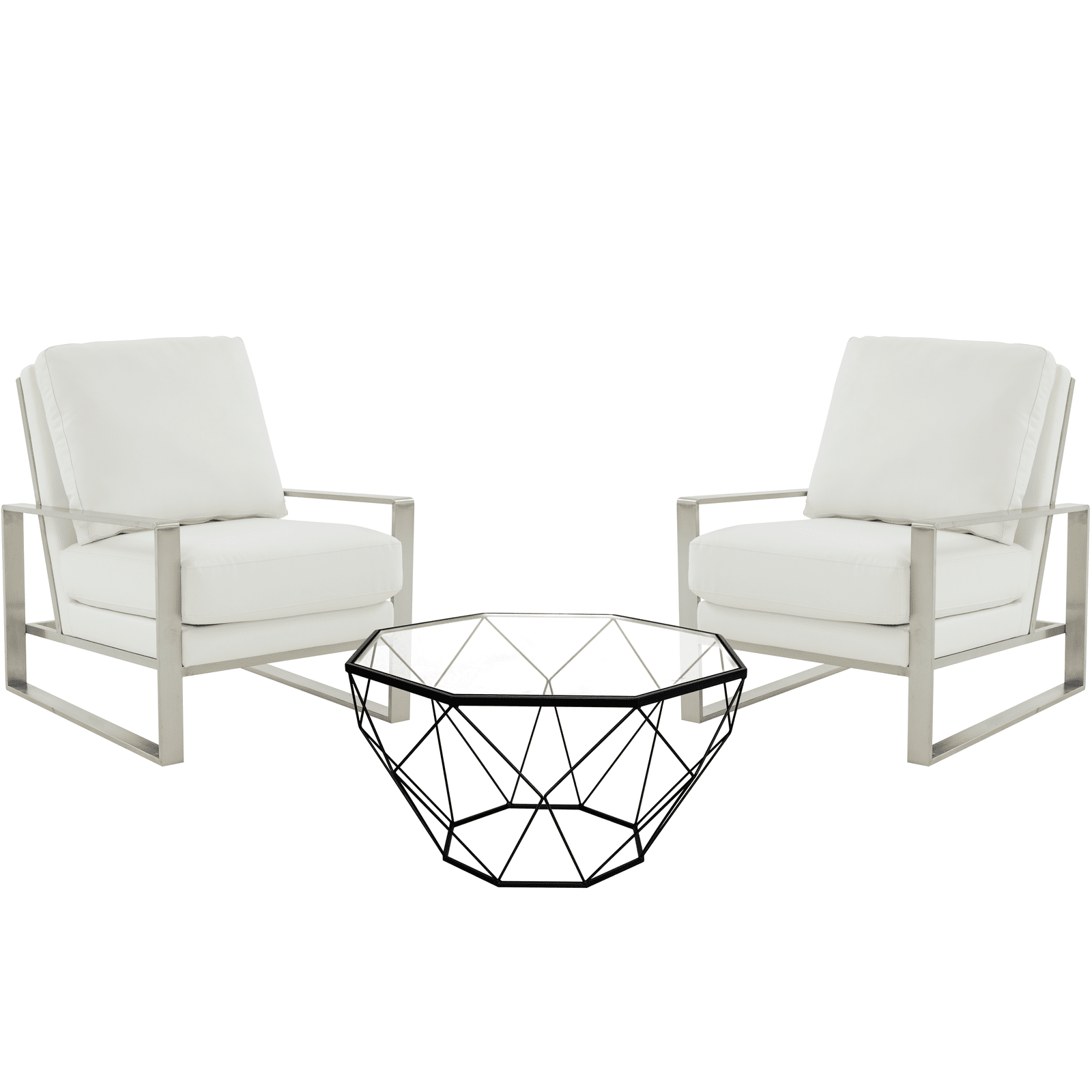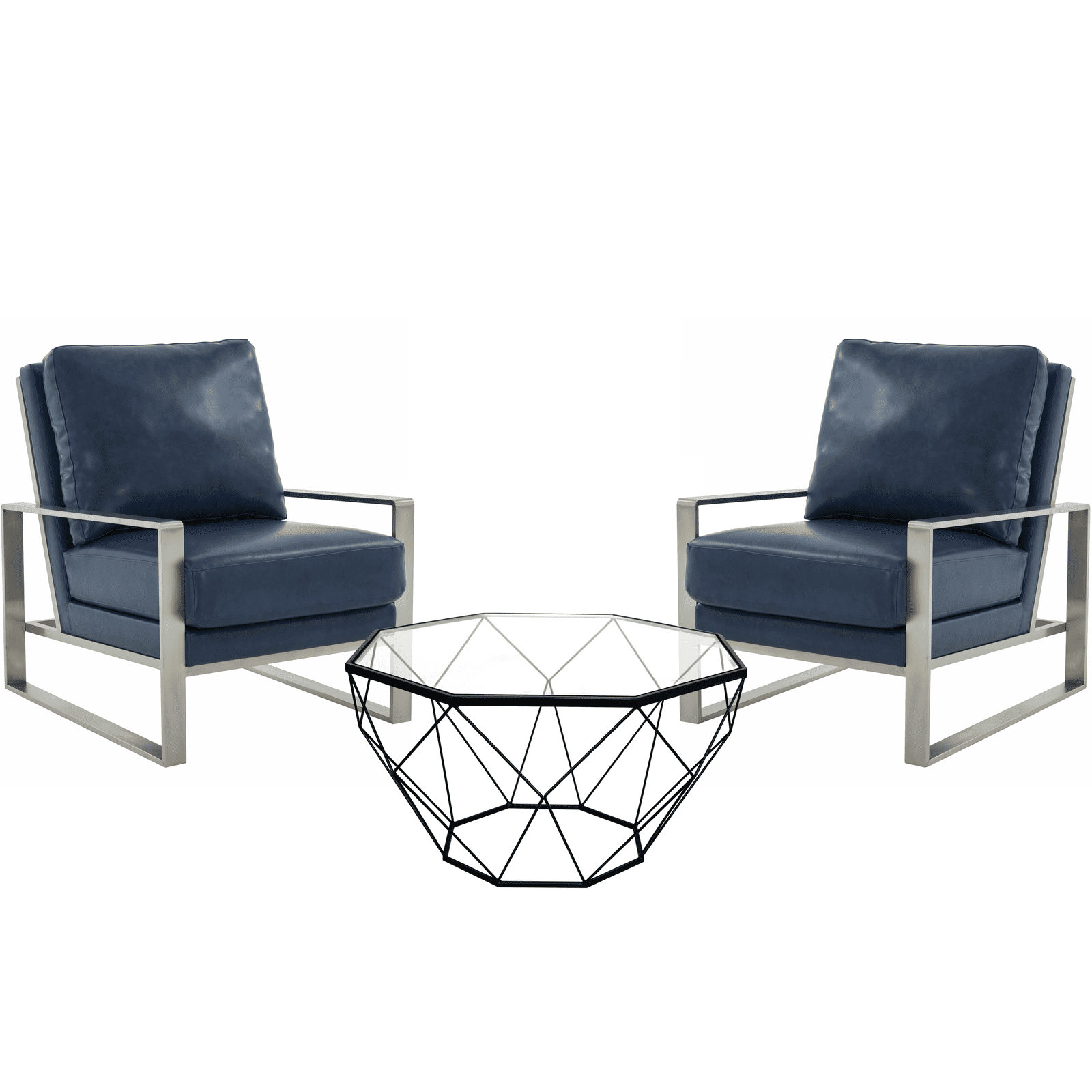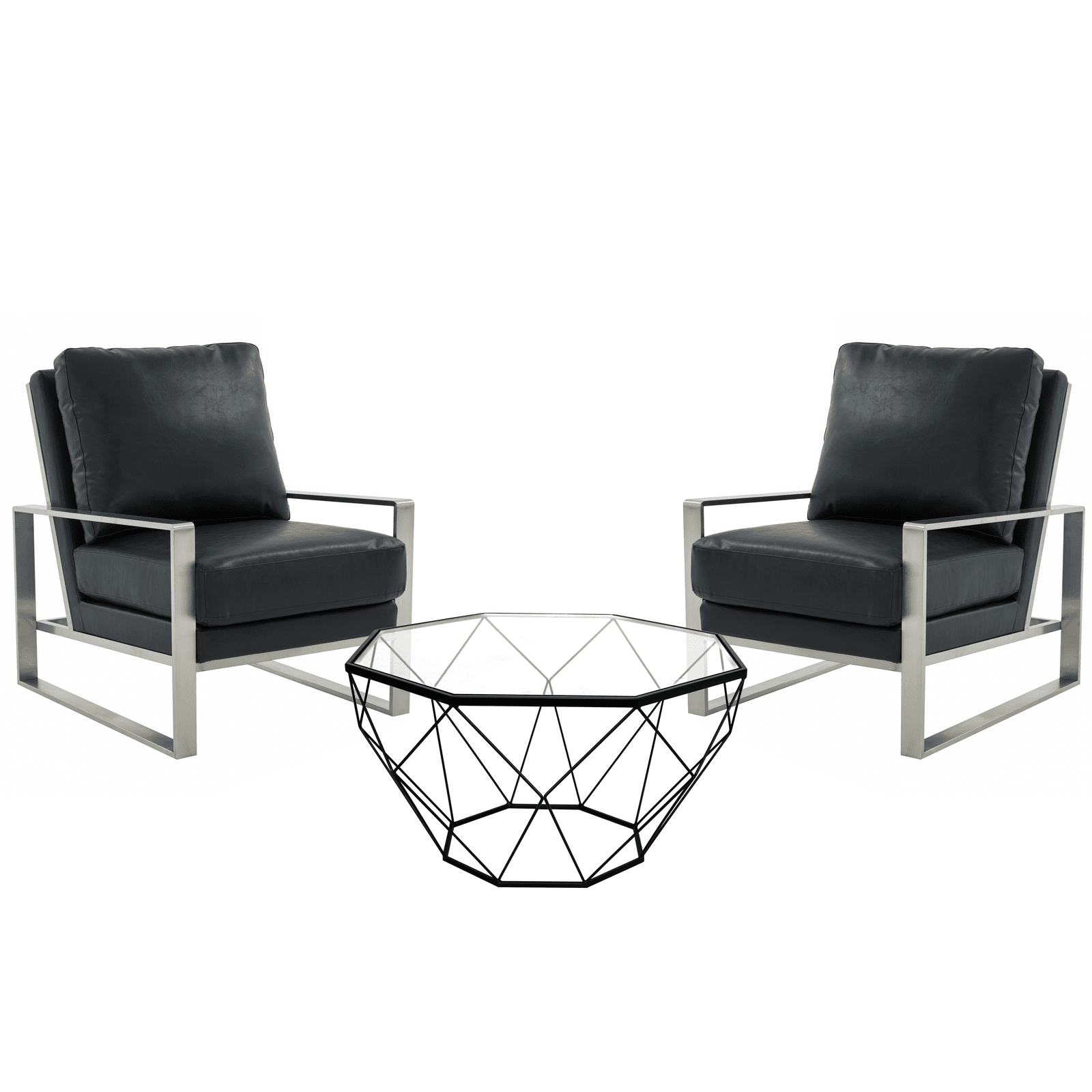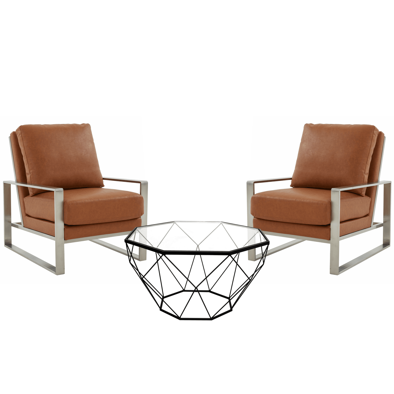 Jefferson 3-Piece Living Room Set with Leather Arm Chairs and Octagonal Coffee Table with Black Base