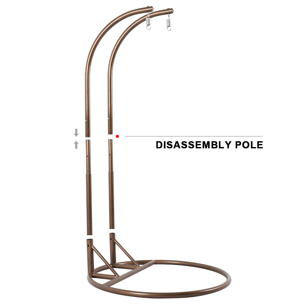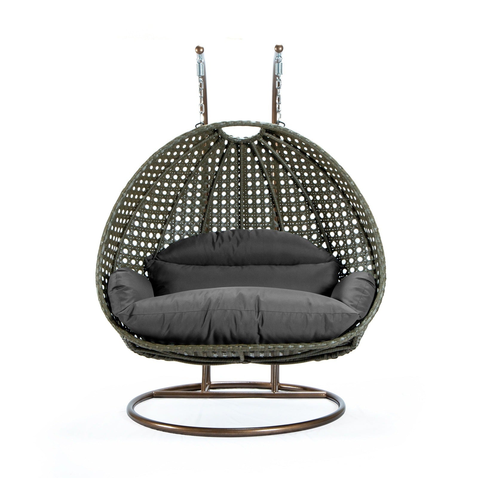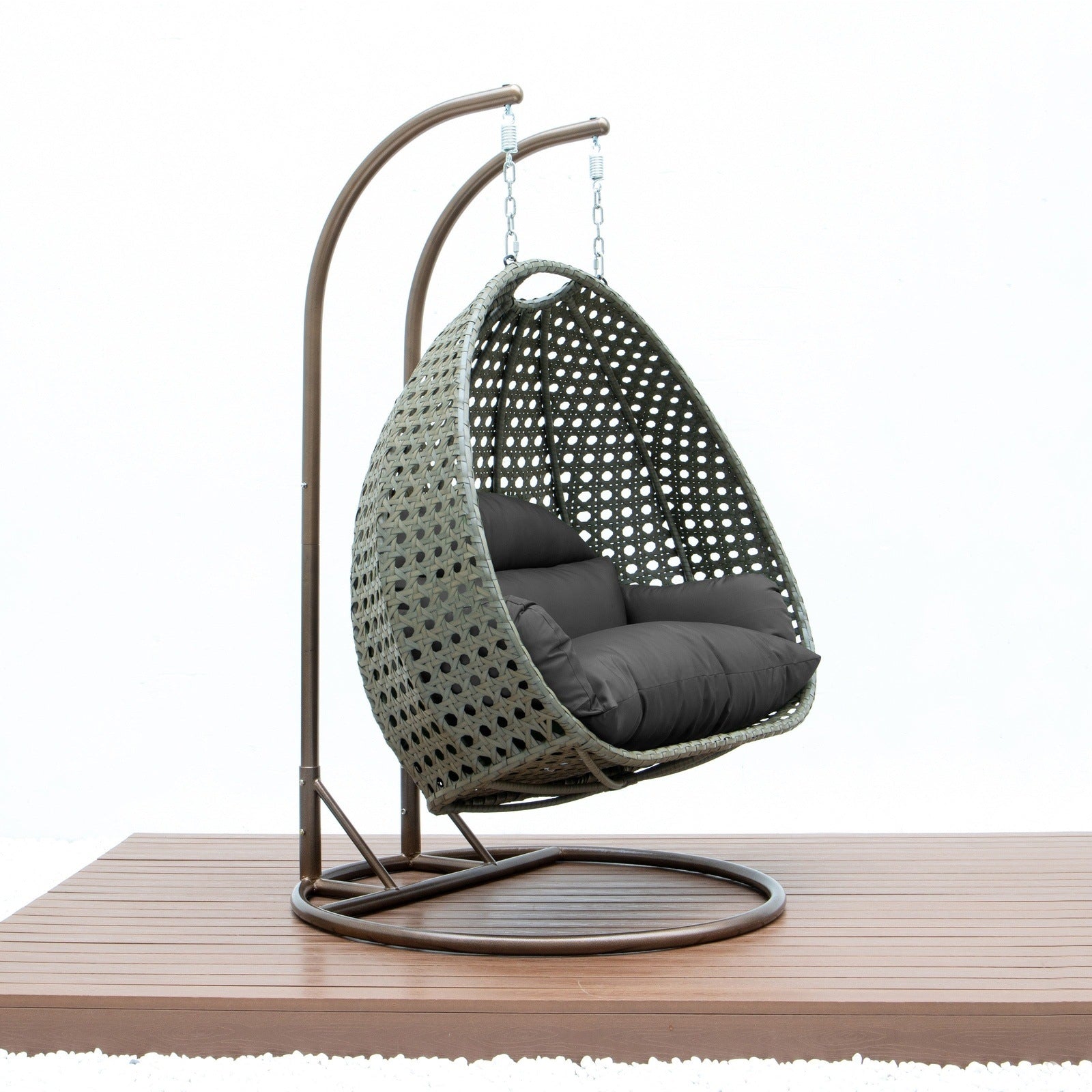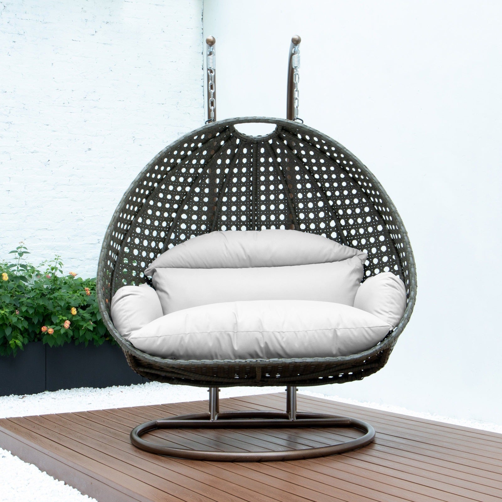Experience ultimate relaxation with this durable, 2-seater egg swing chair, perfect for any weather. Its sturdy iron frame allows for comfortable outdoor lounging, while also providing a cozy spot for indoor reading. Embrace the tranquil beauty of your backyard with this luxurious hanging chair.