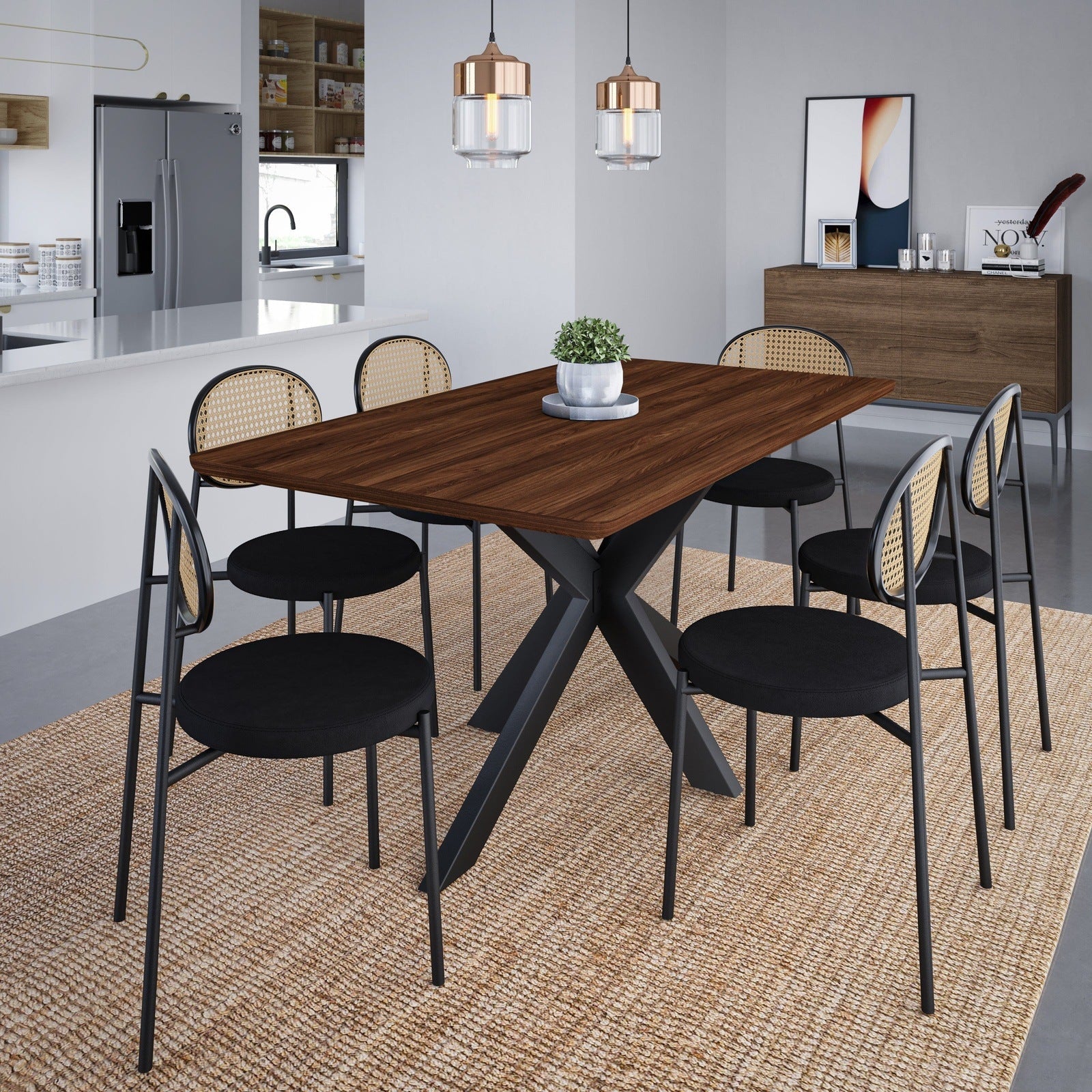 Enhance your dining experience with the Ravenna Dining Table. Featuring a 63" rectangular wood top resting on a beautifully crafted metal base, this table adds a modern and chic touch to any space. Enjoy the comfort and style of this unique silhouette while entertaining guests.