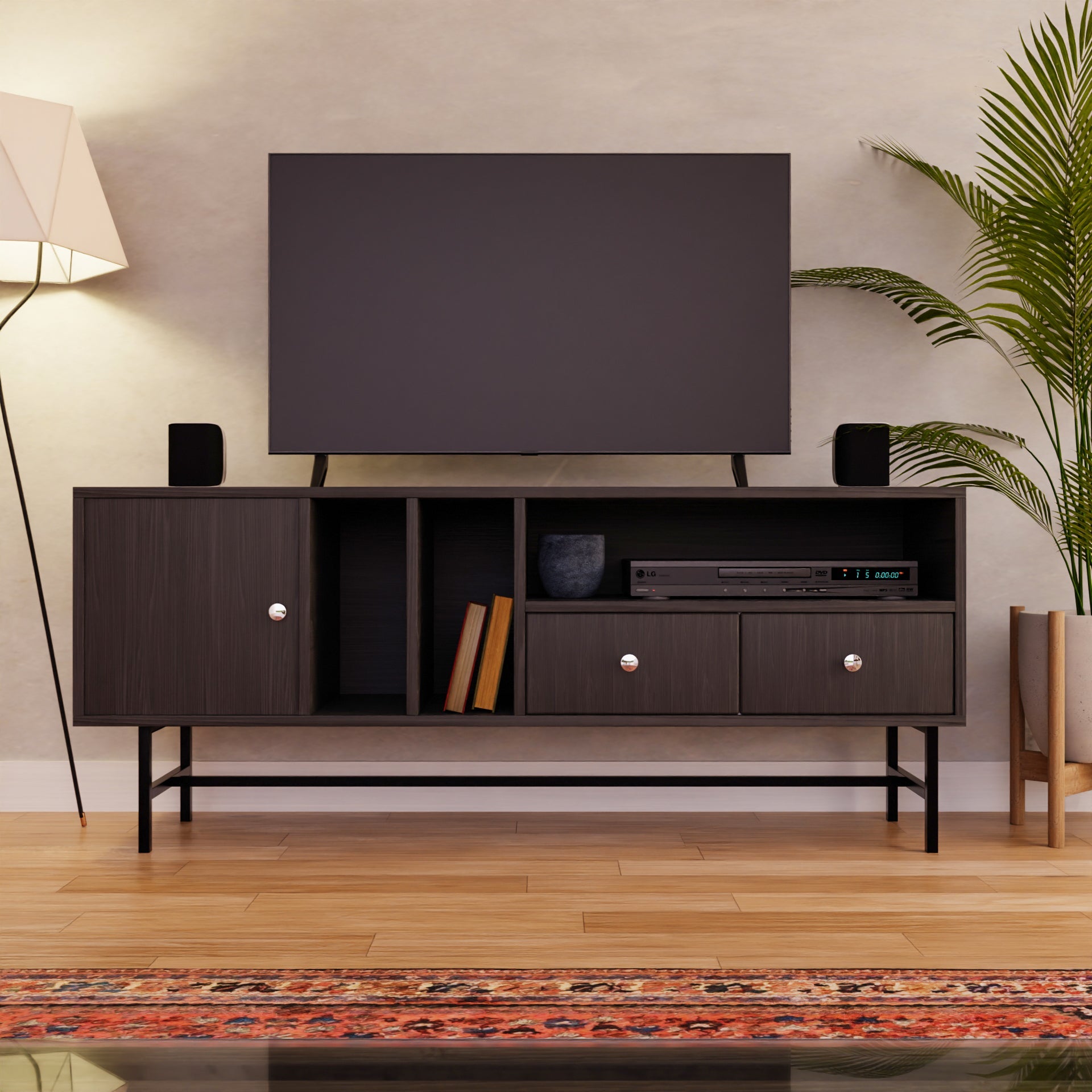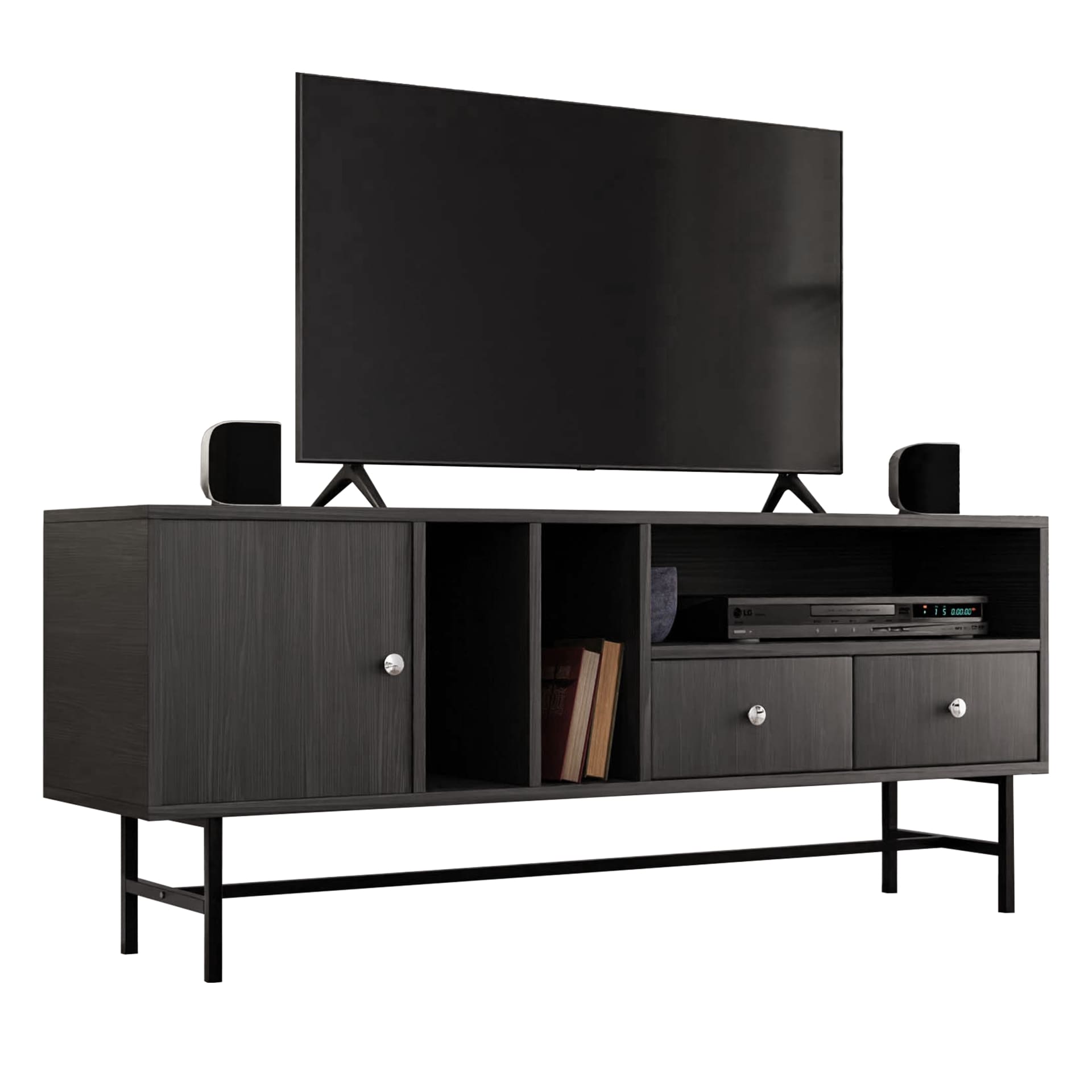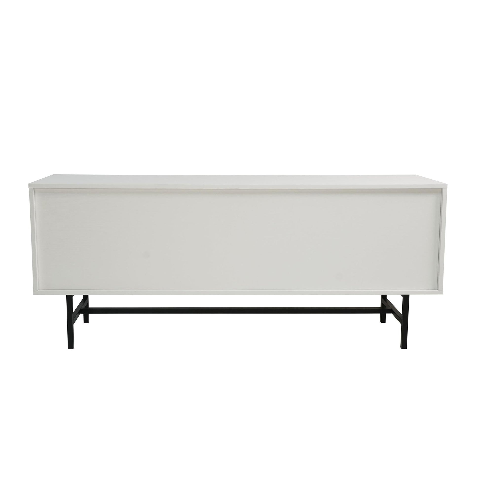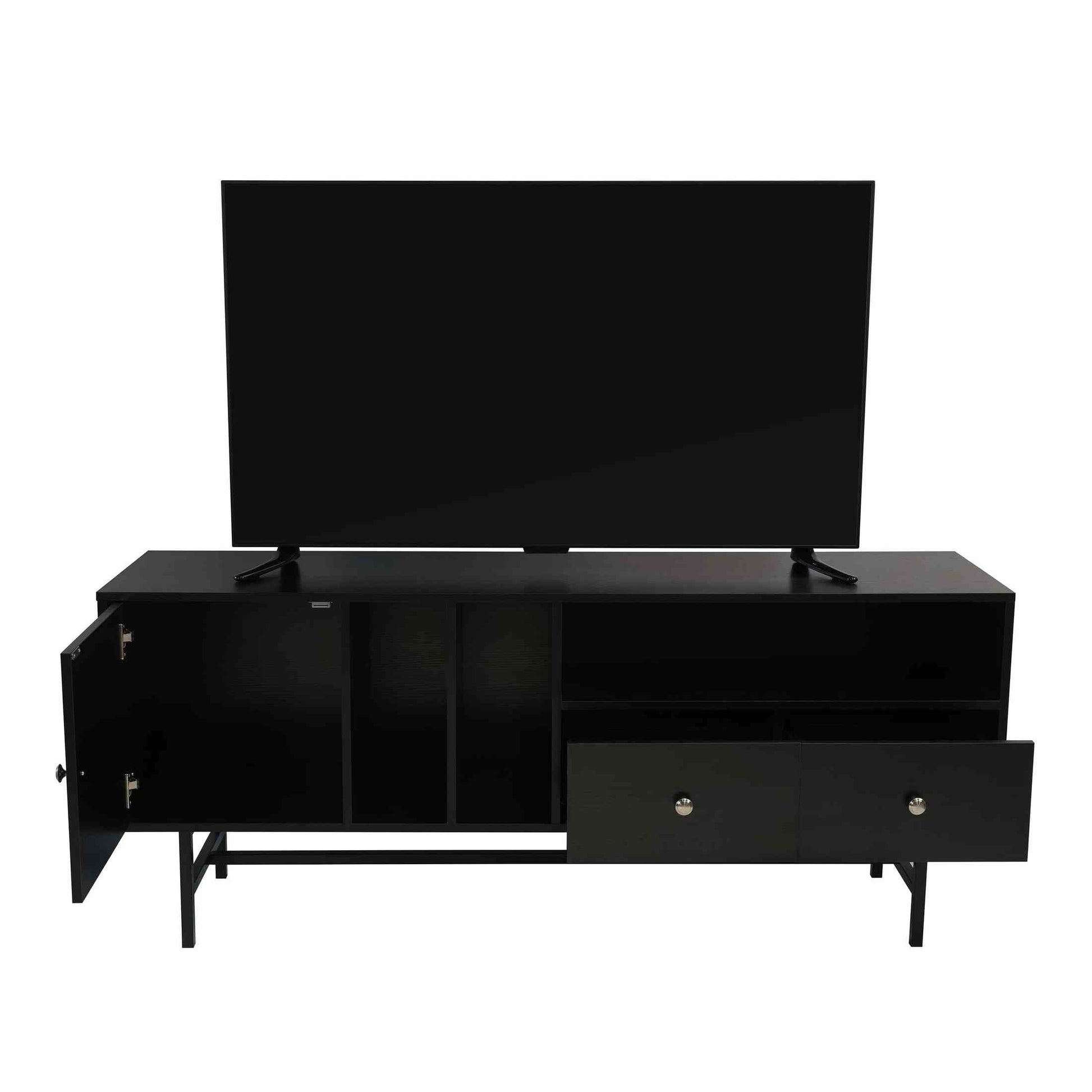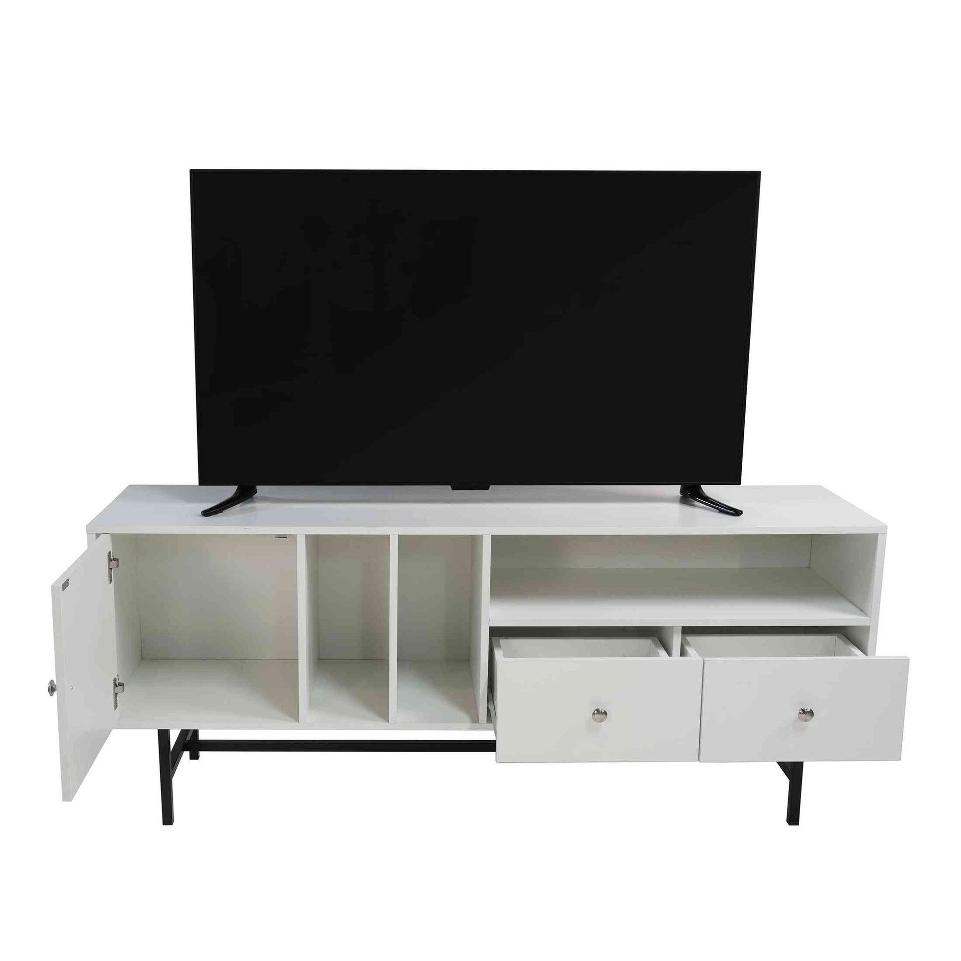 Enhance your living space with the sleek and modern Rochester TV stand. Its enclosed storage keeps your space organized while the powder-coated iron legs add a touch of industrial style. Perfect for any room in your home, this TV stand is both functional and stylish.