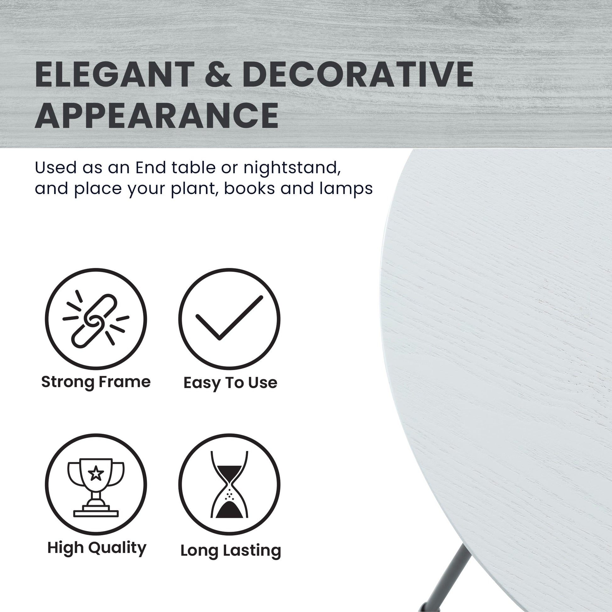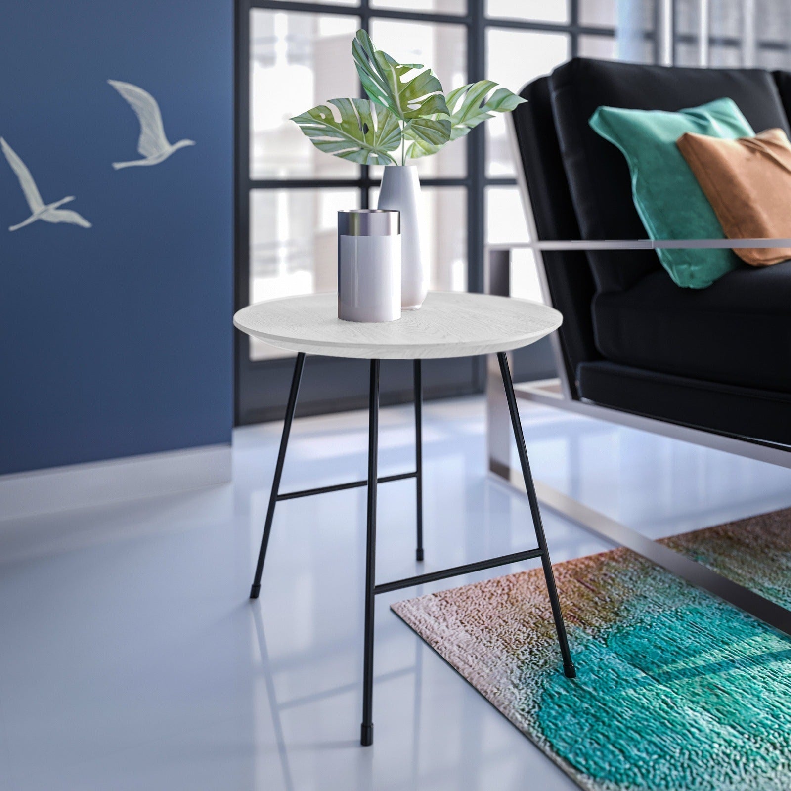 Elevate your living space with the elegant and stylish Rossmore round side table in white steel. Designed with a mid-century flair, this table boasts a durable steel frame and medium-density fiberboard top, perfect for organizing your space. With its sleek modern design, this side table is sure to add sophistication to any indoor setting.