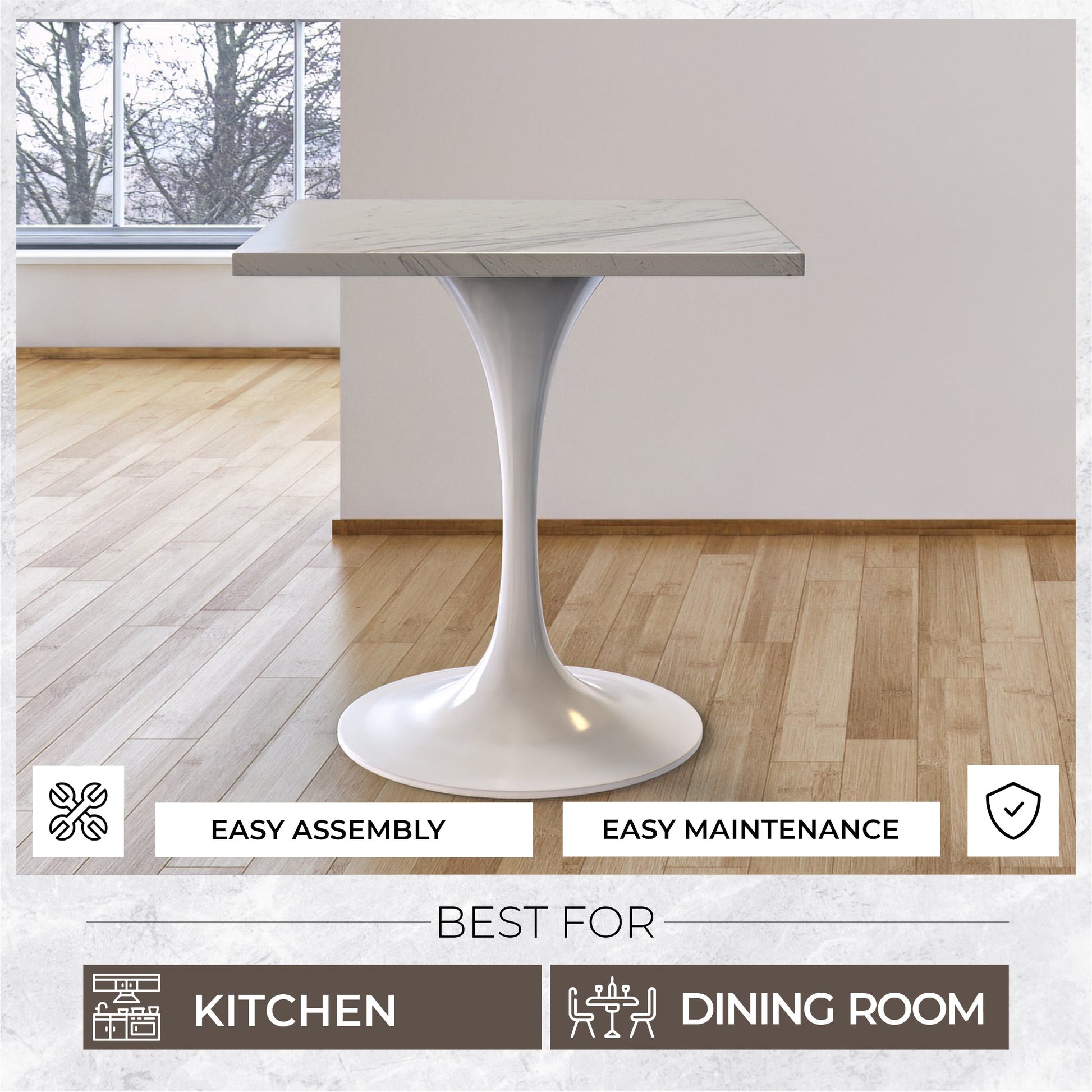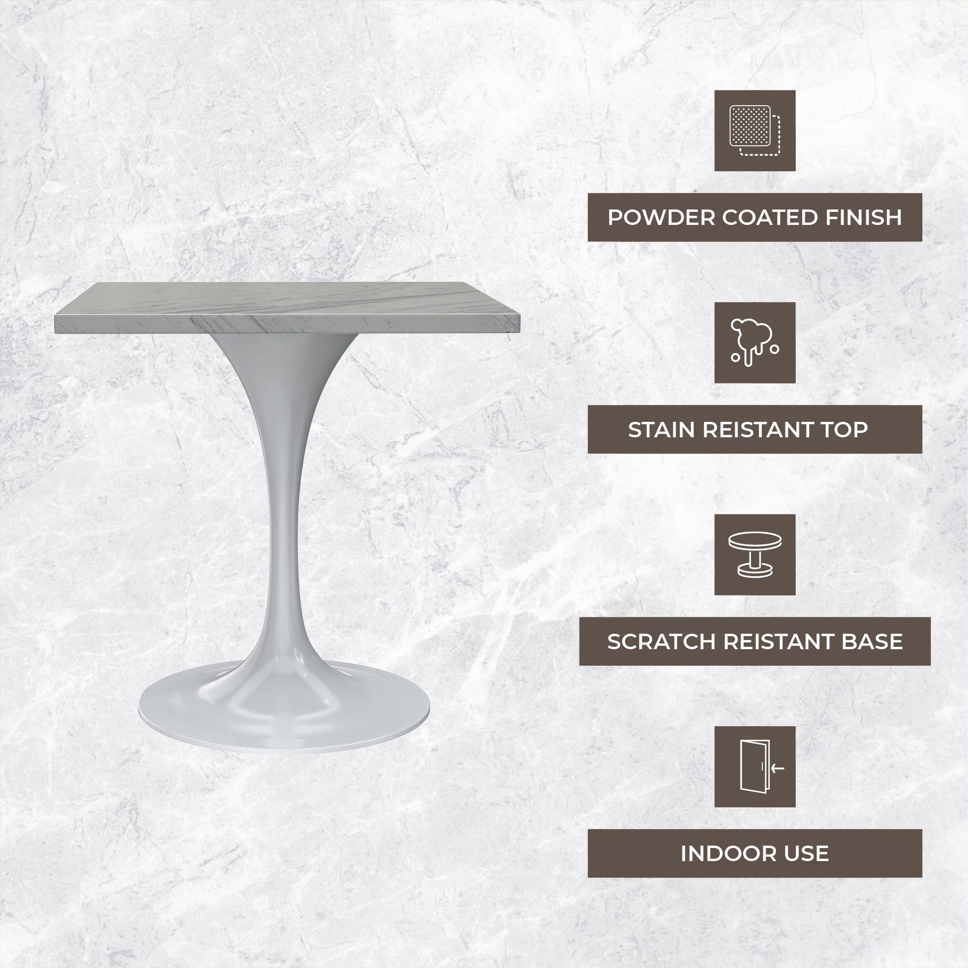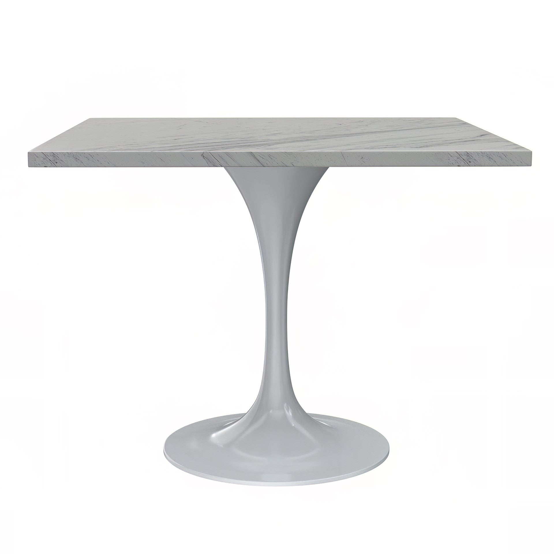 Verve Square Dining Table with a Laminated White Marbleized Tabletop and White Steel Pedestal Base