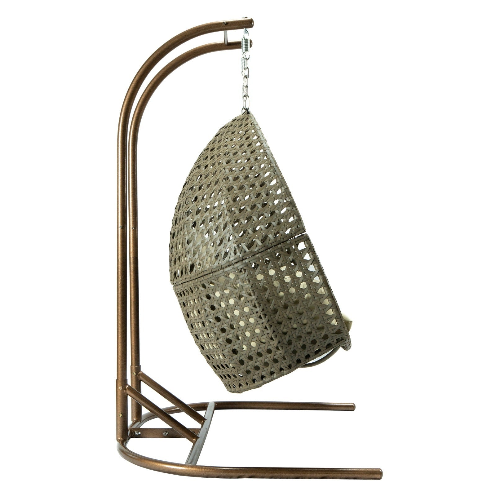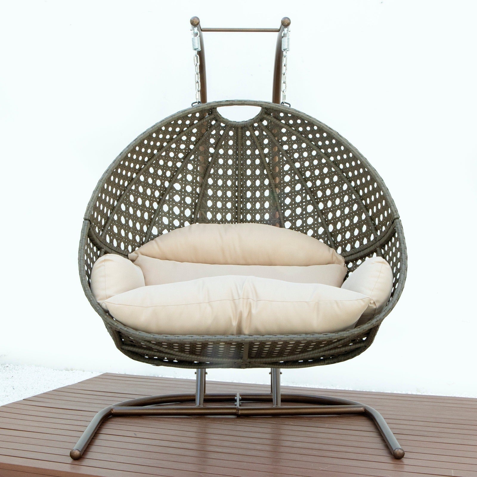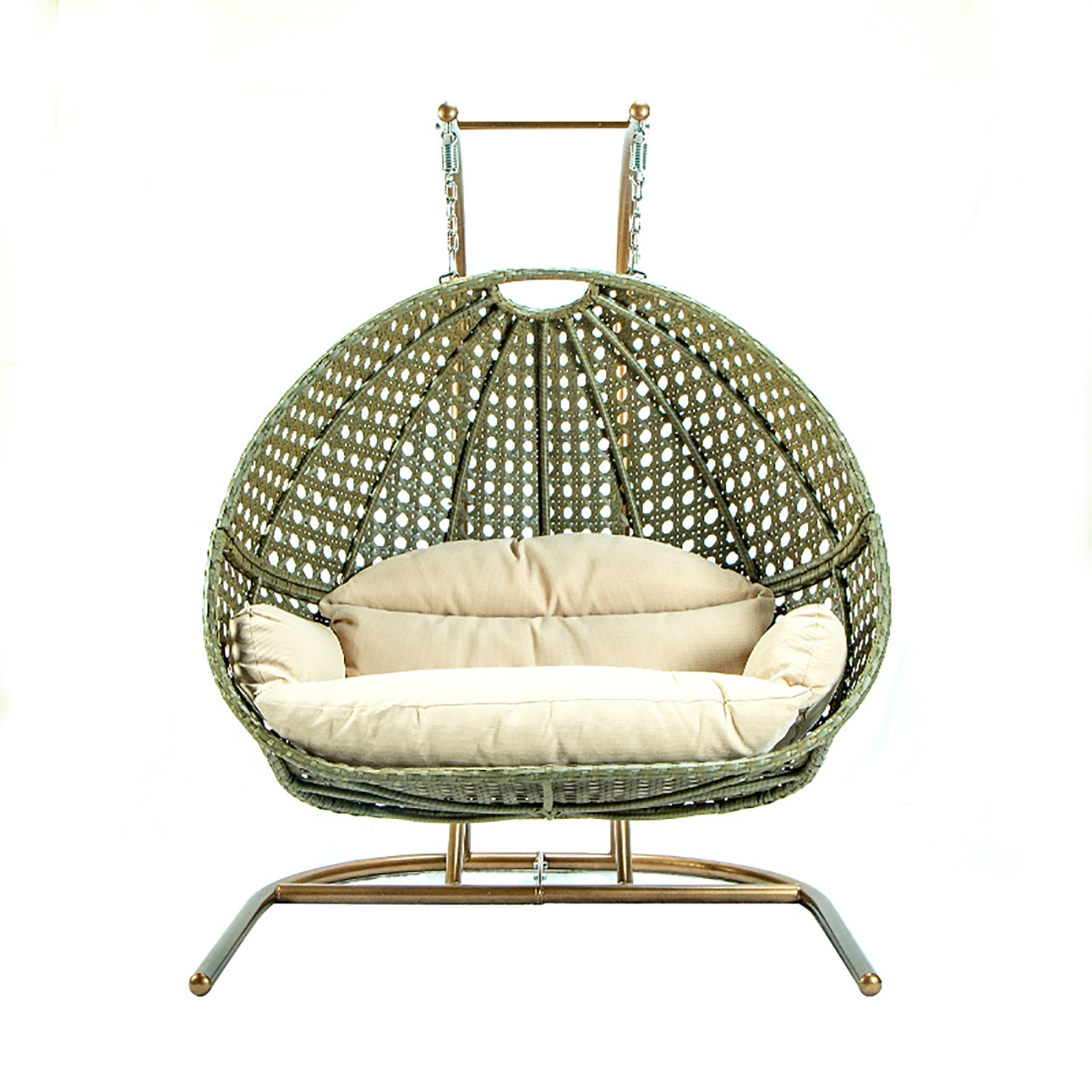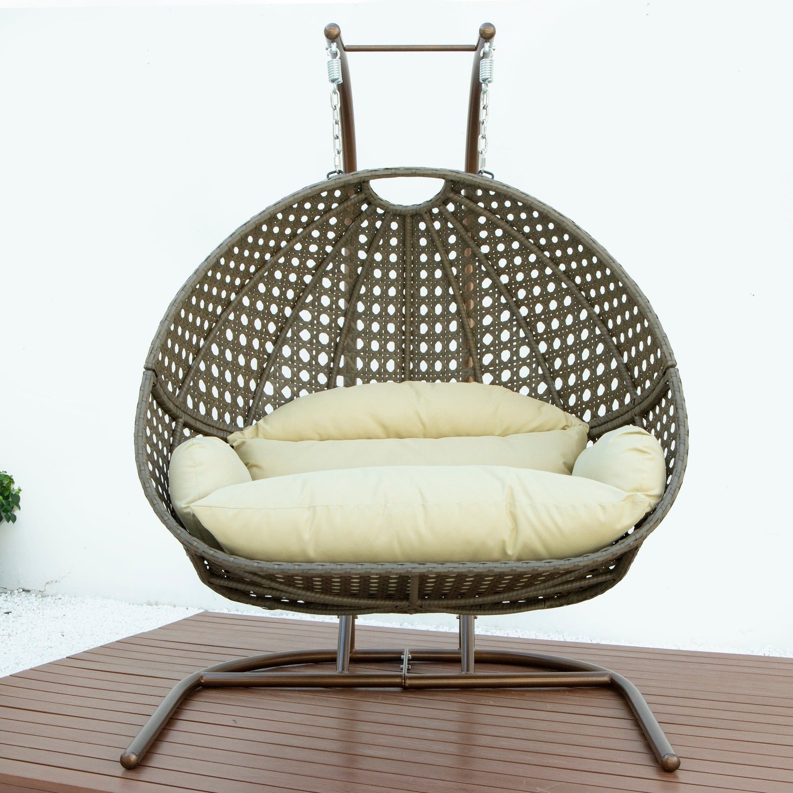 Wicker Hanging Double Egg Beige Swing Chair with an Iron Base