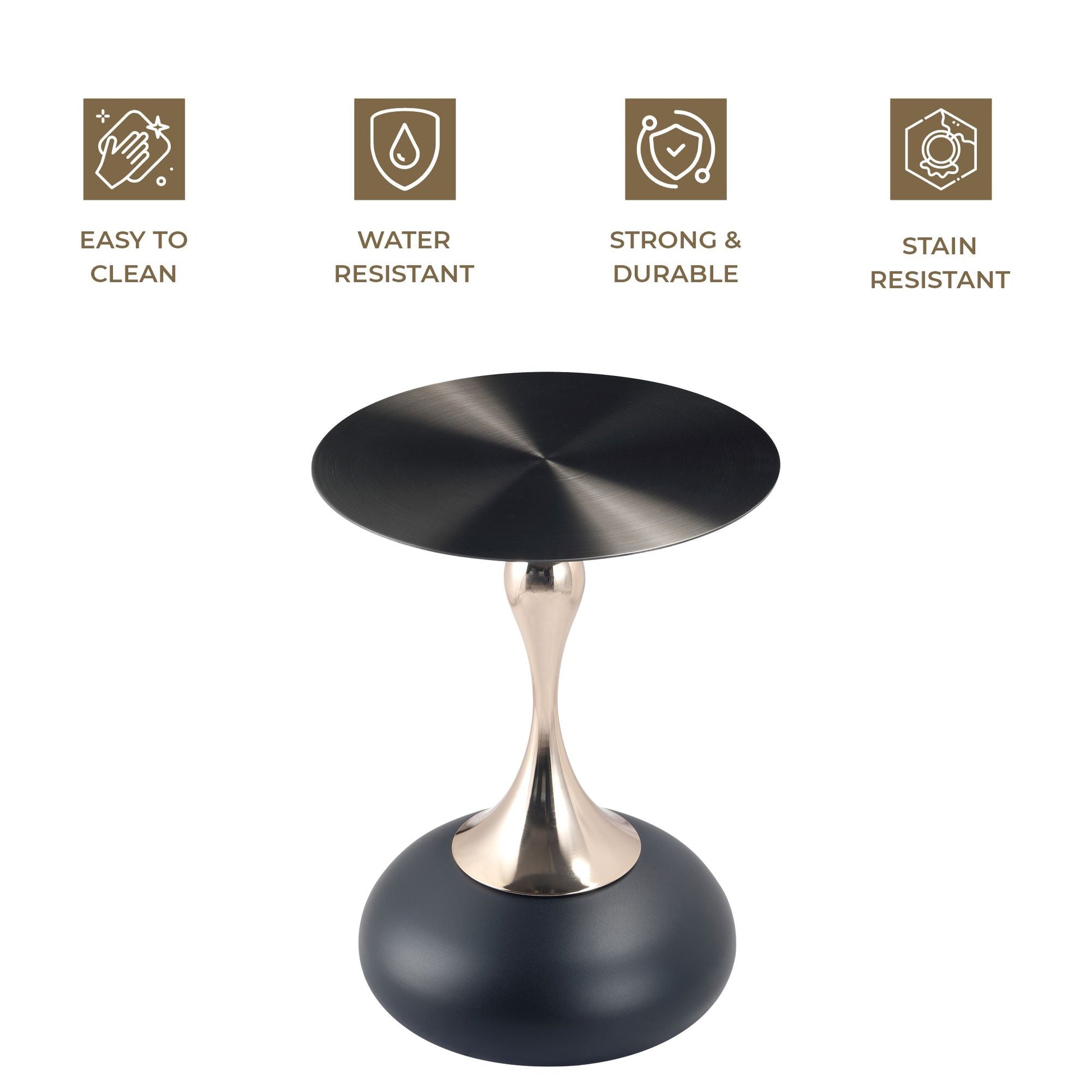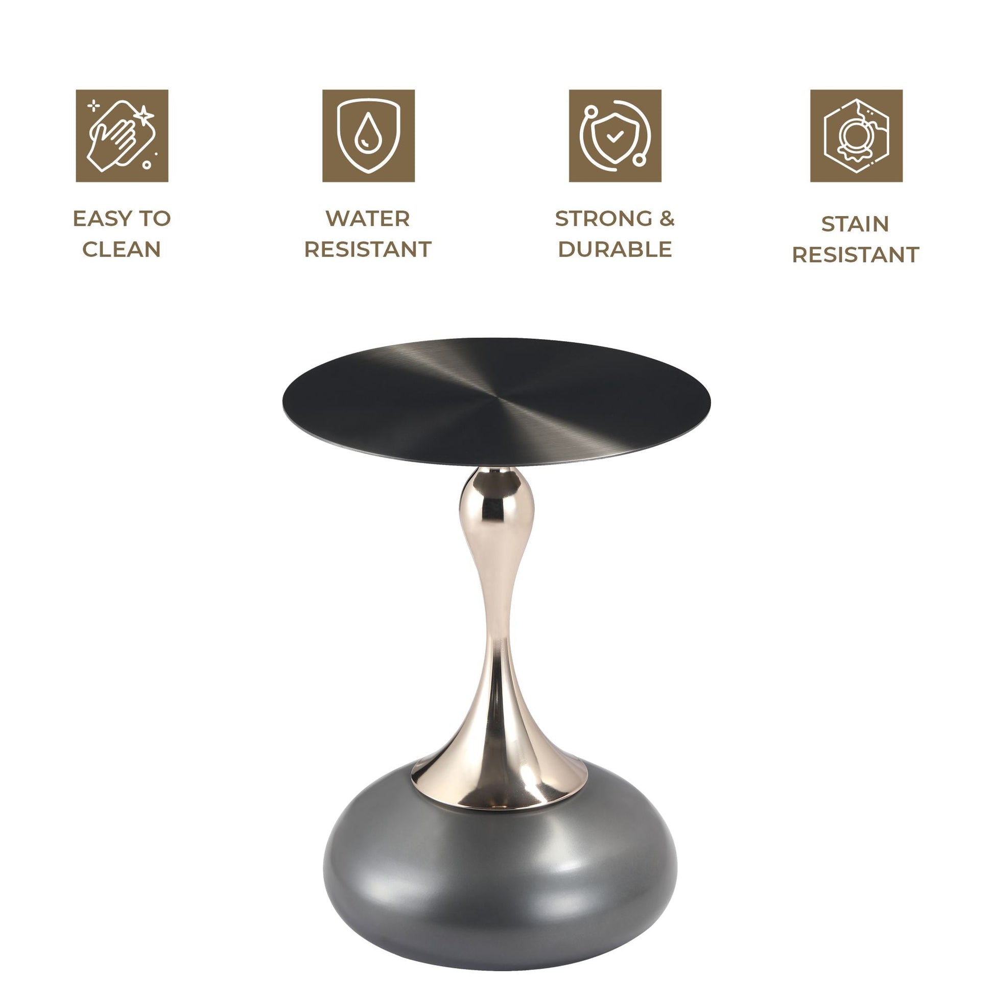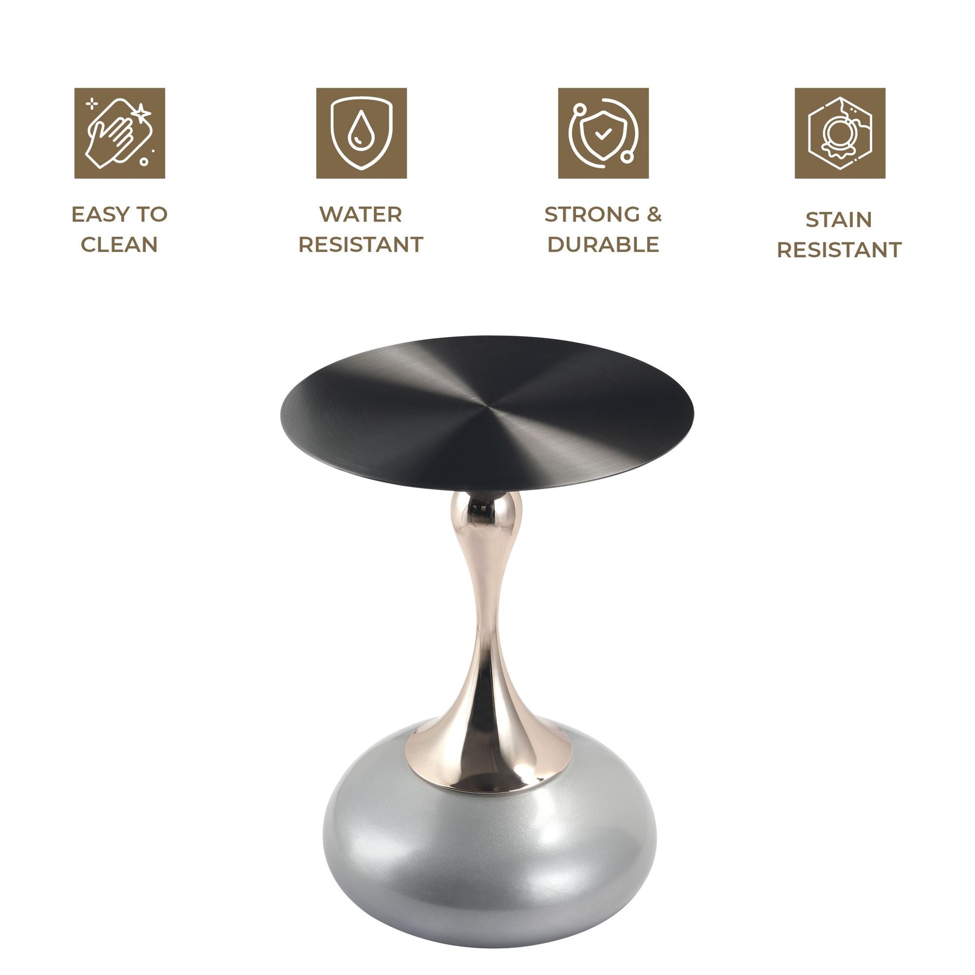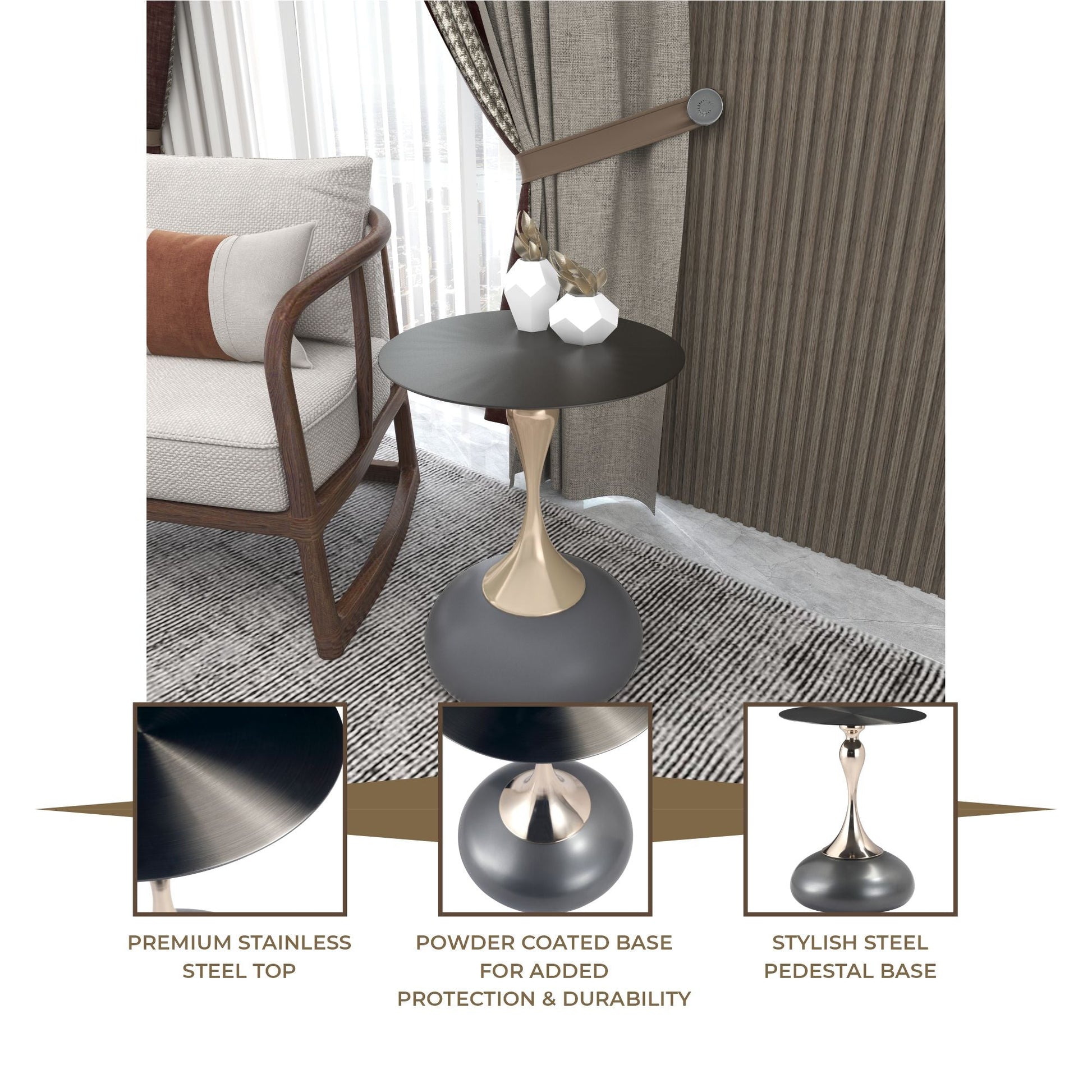 A stylish and versatile addition to your home decor. Its sleek, metallic look comes from a circular tabletop with a brushed finish. Crafted from durable stainless steel, it features a stable pedestal base with a powder-coated finish, resistant to scratches and corrosion. Ready to use and easy to maintain, it's perfect for end tables or displaying items.
